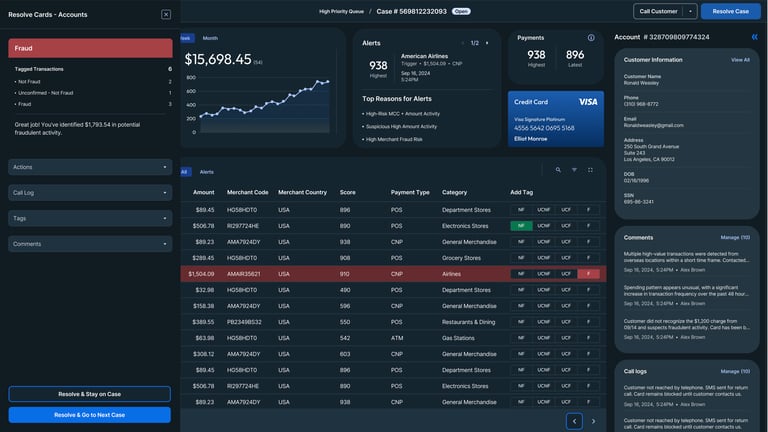 Led the design of a first-of-its-kind Case Management system that reimagined how analysts investigate and resolve fraud cases. By introducing intuitive workflows, and role-based experiences, I transformed a complex, regulation-heavy process into a streamlined, intelligent product.