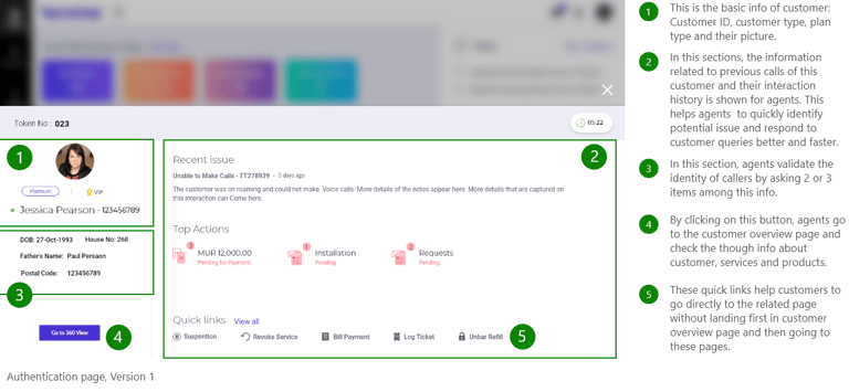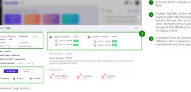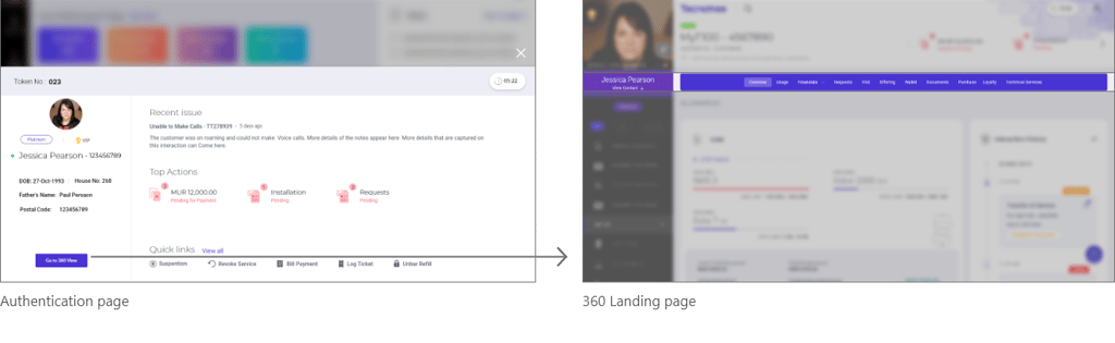 After authenticating customers, agents go to 360 landing page (customer overview page) and depending on the type of customer request or complaint, they review the info in this page or info inside other tabs above. After answering the call, they log a ticket and connect to the next caller. For making this journey quicker, we requested the business to send us the top 5 issues and queries asked by customers during the last 6 months. By doing that, we wanted to display some of those important info inside the authentication page, so that the agent is no longer needed to go to 360 page and check the info on that page. I also wanted to know the most frequently used tabs so that I could place a set of quick links in the authentication page that navigates agents directly to those pages instead of first going to 360 and then click on the above related menu. For example, for general queries which does not need checking the 360 page, agents can log ticket in the authentication page while currently for all queries they first need to go to the 360 page and then log a ticket.