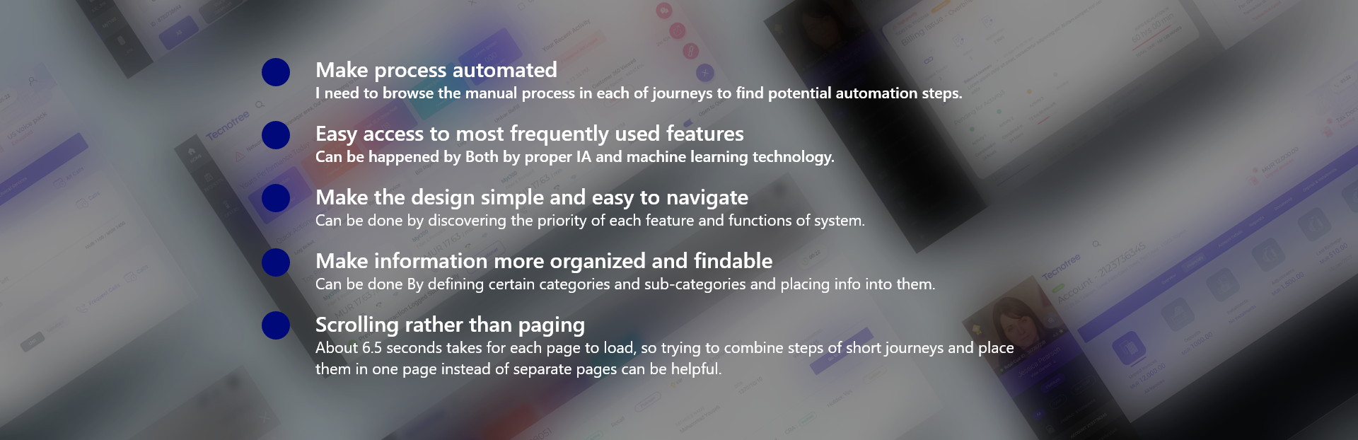 When I joined the team, I was the first UX designer of Tecnotree’s onshore branch. Offshore design team was working on designing the new core CRM system for a number of OpCos and my responsibility was to evaluate and redesign those core designs based on MTNI company requirements. Tecnotree is a global provider of IT solutions, and it provides digital products and services including DCLM, DCM, DOM and DCBS for IT companies including MTN Irancell. As it was the rst IT company I was working in, first, I needed to thoroughly understand the products and then identify the business goals. After that I started planning to conduct the user research, drawing customer journeys, desning new features, prioritizing them and lastly, user testing the updated designs.