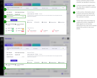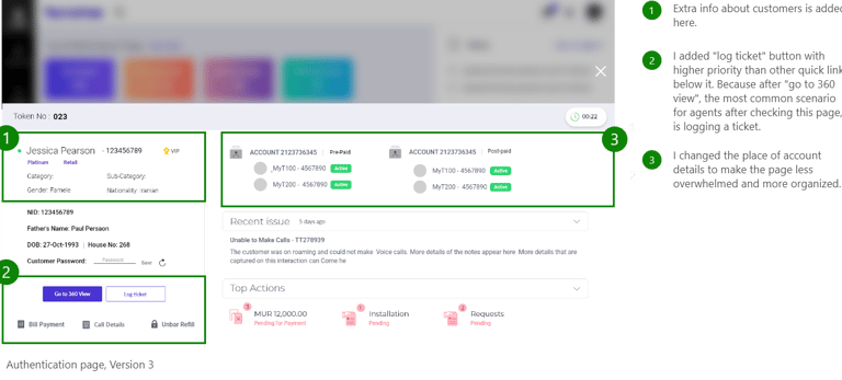In the initial version, I prioritized essential elements for customer validation and introduced a streamlined “Recent Issues,” “Top Actions,” and “Quick Links” module. This design empowered agents to anticipate a customer’s likely reason for calling and address inquiries directly—without navigating to the customer dashboard—significantly improving response speed and operational efficiency. I designed 3 versions: