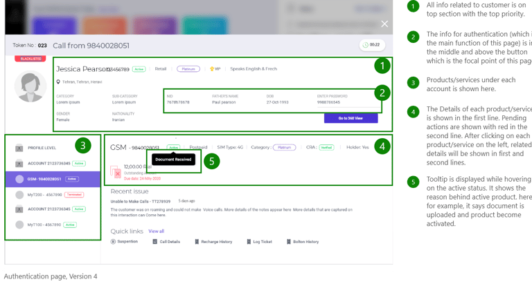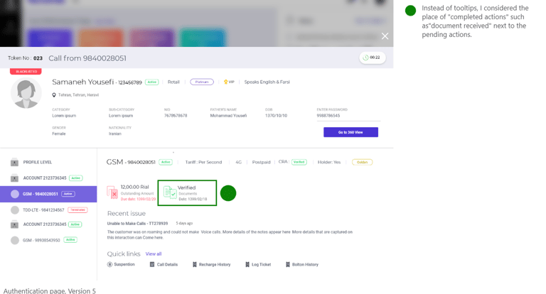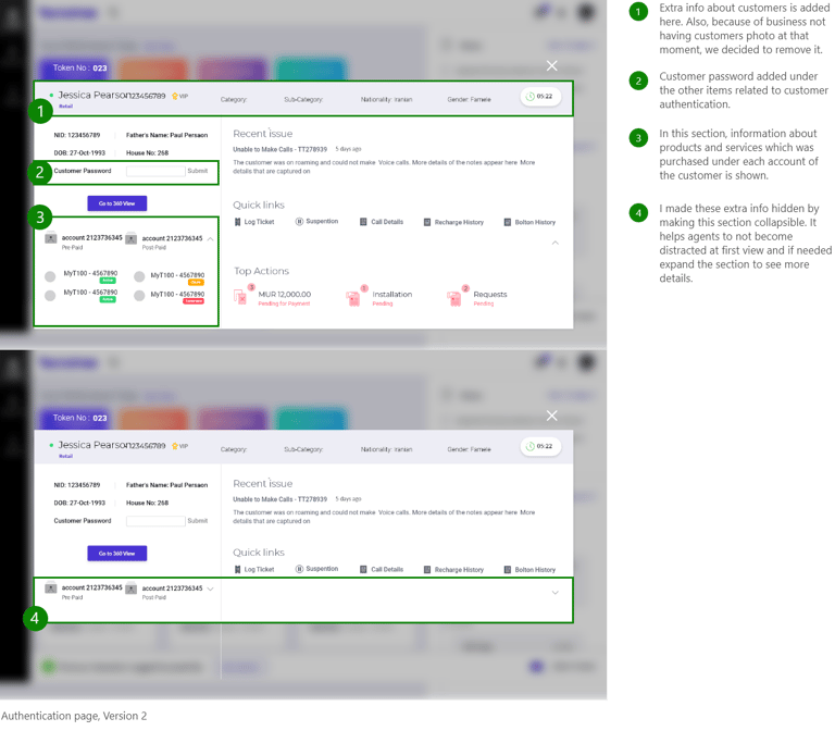 For designing the authentication page, rstly, I needed to thoroughly understand this step and the reason behind it. As this step is the first page agents encounter with after connecting to the customer, it is important to be quick, provide enough information for authenticating of customer, and also include quick links and extra info which relive agents from checking other tabs of the system to nd that information. Back office agents do not need to interact with this page as they do not communicate with the callers directly.