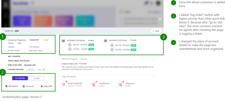 I designed the authentication page for front-office agents to be fast and informative, reducing context switching with key details and quick links. Using analytics data on the top five customer issues and most-used tabs, I surfaced essential info and shortcuts so agents could log common tickets without leaving the page.